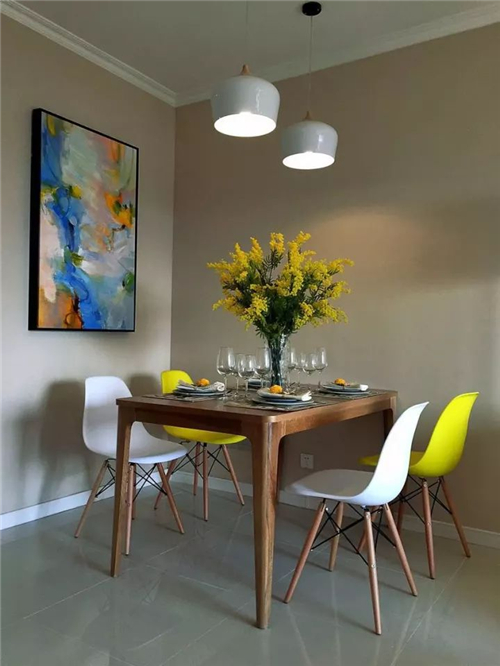 ▲▲▲餐厅在入门的左侧,深色系的餐桌。搭配抽象的油画和明亮的椅子,色彩更丰富。