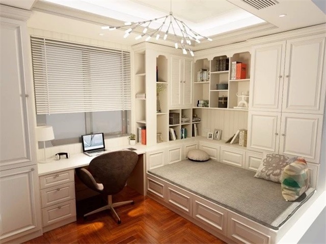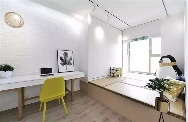 这样不仅可以拥有书房,还可以把这个空间作为休闲或客房用,整个空间的利用率更加好。把书桌跟榻榻米床组合在一起,书桌上方还可以装上书架,整体就显得更加实用大方。