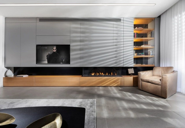 内嵌于墙面的电视柜最节省空间,根据墙面特点和电视的大小,现场定制收纳柜,容量大又整齐,可以满足大部分的公共物品收纳或图书、藏品的收纳。