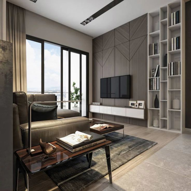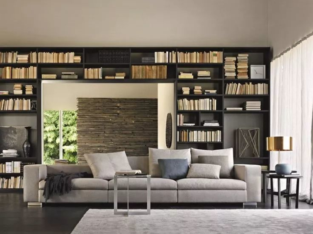 一些户型较小的居室,往往将书房的功能与客厅进行合并,因此客厅会有大量的书籍需要进行收纳。常见的收纳方式是在沙发边设计开放式书柜,既方便拿取,又不会占用过多的空间。