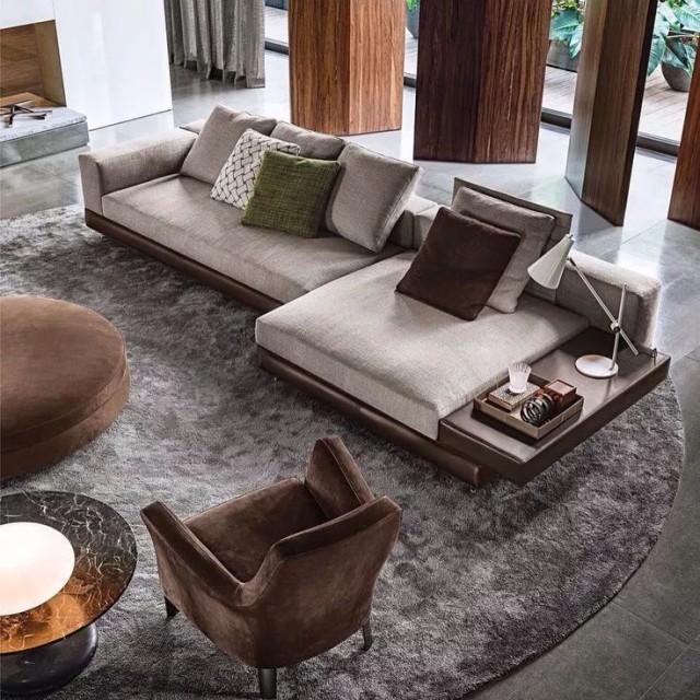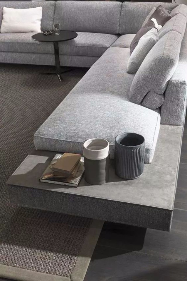 高低不等的边几看似没有强大的收纳功能,但是却可以根据不同的使用要求,与其他家具搭配使用,来客人了,也能有放茶杯的地方。如果是喜爱阅读的业主,也可以在边几上搁置常看的书籍。还可以选择带有边柜台面的沙发,更加方便实用。