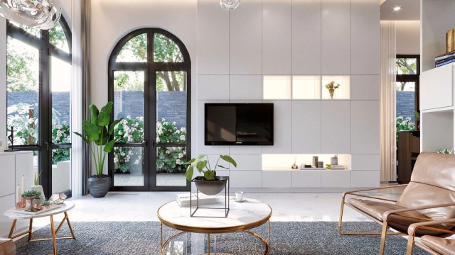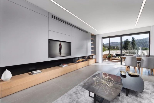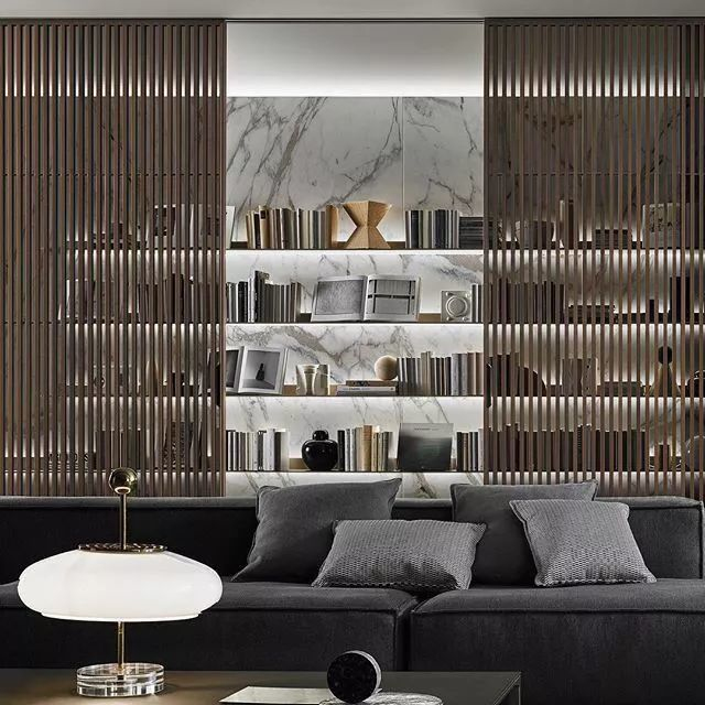 如果电视背景墙想要以展示和美观为主,可以在大理石、木材或石膏板等电视背景墙上嵌入壁龛,新颖的结合方式,可以为空间带来意想不到的装饰性。