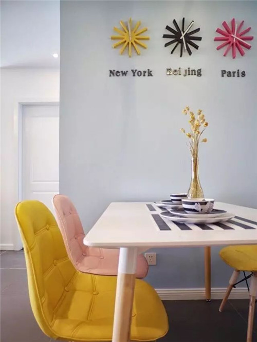 白色、粉蓝、灰色、原木构成硬装色彩的调子,突出的黄、柔和的粉,活泼了整个空间。