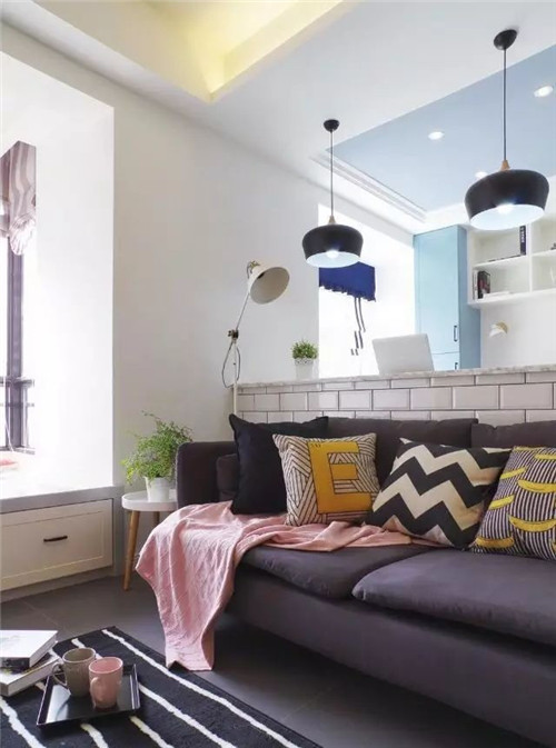 打通沙发墙用作吧台,扩大客厅面积。简单清新的色彩能融化旅行的疲惫。