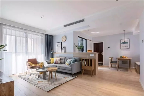 从入户至公共领域空间,整体通铺木质地板,简单吊顶,客厅采用无主灯设计,主要以点光源作空间照明,简洁利落。