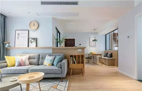 开放式的布局让功能区的联系显得更为紧密,在浅蓝色与白色两种素色背景墙的利落搭配下,木元素的融入可以带来居家的温暖感受,让沉稳与质感和温暖柔和达到平衡。