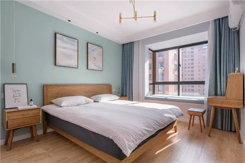 主卧木色地板与木质家具,书桌柜是定制家具,能更好的适应户型,卧室的边边角角也能充分利用。让卧室兼顾了书房、梳妆、办公的功能。另外搭配蓝绿色背景墙与窗帘,具有设计感的铜色吊灯与背景装饰画用于提升空间整体档次。