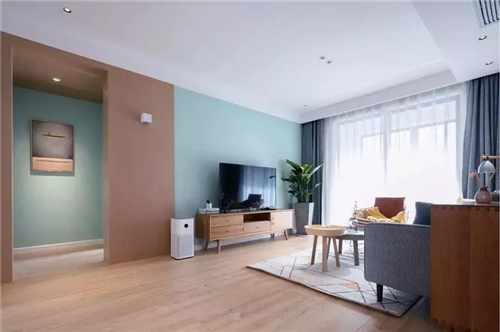 选用绿色系电视背景墙,搭配木色电视柜与侧面走廊设计相呼应,大盆绿植给空间增添生机。