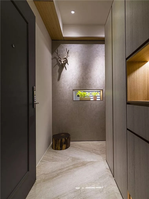 玄关和客厅之间是用了一堵收纳墙来做隔断,玄关侧摆上换鞋凳和装饰品,侧边就可以用来做收纳了。