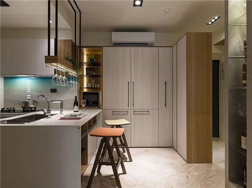 餐厅和厨房是整合在了一起,用吧台来代替餐桌,开放式的厨房不可避免的就是油烟问题,需要多加注意。