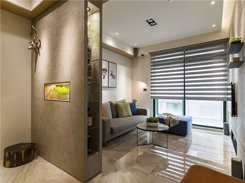 靠近客厅的这一面是做了个嵌入式的书墙,摆放自己喜欢的书籍和绿植,让客厅充满了文化气息。