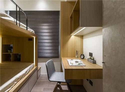 次卧是做了上下铺的设计,可以方便陪伴孩子。把衣柜和书桌结合在一起,小小的空间也需要满足孩子的学习需求。