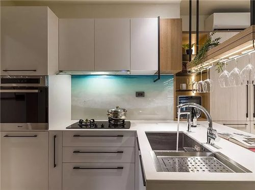 厨房墙面用靓丽的渐变色来点缀整个餐厨空间,让人感觉更加有设计感。