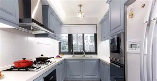 如果想要摆脱单一的白色追求个性的厨房,就可以选择双色搭配,这款厨房运用了湖蓝色加香槟色。