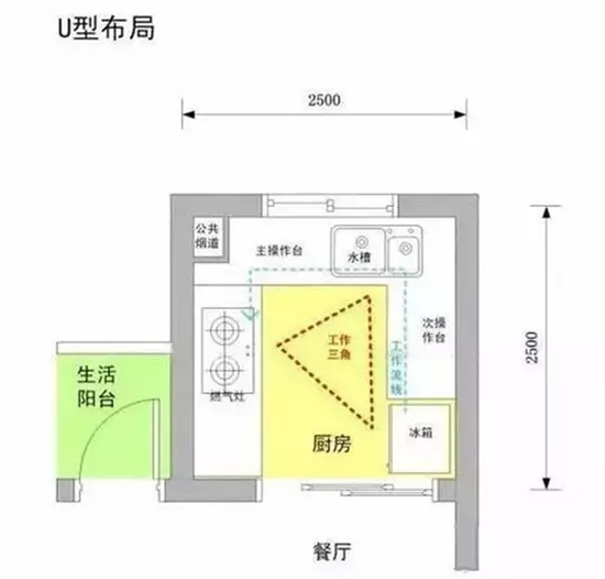 1.U型厨房一般是在比较方正的厨房中出现,要求厨房面积大于或等于4.6平米左右。