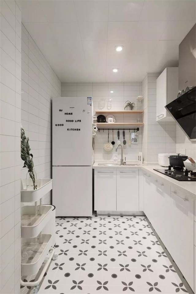 ▼厨房最大的缺点就是没有任何光线,所以设计师用了统一的纯白色设计,让厨卫空间显得大一点也可以显得更加亮堂,墙上的瓷砖是专门选的亮面瓷砖,一点点光的折射、反射就会让空间更大。