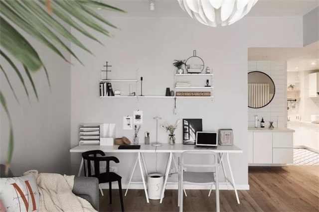 双人工作台非常方便工作,而且桌子长度和这面墙长度很吻合,墙上设置了白色简约置物架,让这个空间宛如一个小书房。