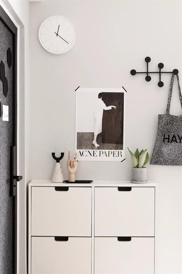 ▼入户位置放置了简洁的衣架,可以放置衣服和包包,宜家的简易鞋柜可以放置鞋子,鞋柜本身很薄不太占用空间,整体空间实用又简洁。