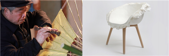 我们尝试将油纸伞重新设计,让人们继续使用。糊伞的师傅亲手教我们糊伞,当皮纸糊在一个平面上的时候,人们其实就可以把这个伞折起来,当我们想如果把它糊在一个曲面上的时候,没有用任何的辅助的材料,只可以用水反复糊起,当糊起来之后,我们发现材质十分坚硬。经过尝试,我们发现油纸伞其实是可以做成一把椅子。