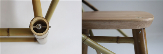 我对竹的认识很少,所以就到湖南益阳跟一些制竹工艺师交流。我发现湖南的制竹工艺看起来很有装饰性,我想找一些朴素、直接的手工艺。后来我又去了台湾,跟着一个工艺师3天,跟他去买竹子,看他怎么样做。我提前把椅子的设计图发给他了,他用没有剖开的竹管去做椅子,这是很传统民间,直率的制作方式。我们就思考能不能通过创新,把竹子和其他的材质接合起来。于是我们设计了一件金属配件放在竹管里面,这个配件可以将竹子和其他材料拼起来。
