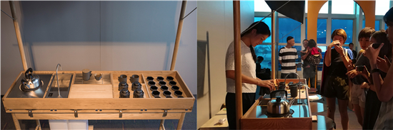 这是一个可流动的设计,可在不同的地方设置,一个茶箱里面有煮水的地方,有冲茶的地方,还有放茶具的地方。前面也有一个台子可以拉出来,方便人站在前面喝茶交谈。我们这个作品在米兰设计周展出过,当时因为人太多,所以我们没办法冲茶,很遗憾,但是大家都对这个很有兴趣。后来我们在香港、首尔、芝加哥等地都有展出过这个作品,并现场泡茶给参观者享用。很多人表示很喜欢这样的设计,尤其是很多年轻人,对中国的茶文化有了全新的认识和体验。