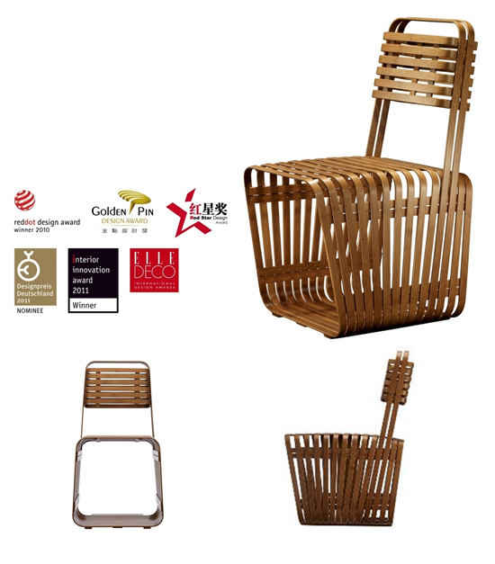 我的第一件“竹”设计作品,是2008年所设计的“椅君子”,整张椅子采用天然竹条完成。用单一竹条与线条勾勒出座椅结构与造型。天然竹条的意义在于它完全体现竹长纤维的特性:韧性、弹性、刚性。