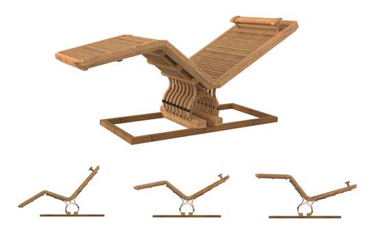 从Bauhaus以来,我认为最好的躺椅非柯布西耶的LC4莫属。参与设计LC4躺椅的Charlotte Perriand通过LC4延伸而来的竹制躺椅也令我难忘。相较于钢管,天然竹条有着它自身的优势,我想运用竹条的刚、柔、韧的特性和我们自主研发的当代竹工艺,来设计一款属于中国当代的躺椅,并以此来探讨竹材更多的可能性。这件躺椅作品取名“椅巴适”,“巴适”一词出于川渝,意为“很好”、“太好”、“舒服”。靠背运用独有的“以骨带肉”竹垫弹簧机构,灵感源于车辆减震器的弧形钢板结构。运用竹的弹性与韧性调节各位置的软硬度,竹条间隙透气,显着提升靠背的舒适度,以坚实的材料达到柔软填充靠背的效果。躺椅中也应用了由我们自行设计,以汽、机车碟刹和地心引力为发想的“重量制动机构”。以低科技的机构成就功能合理、经久耐用又舒适的好设计。