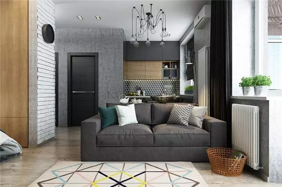房子小,住的人少,自然不需要太大的沙发,简单的双人沙发足够日常使用。沙发颜色比墙体颜色深,窗帘颜色比沙发深,加上白色,黑白灰的配色简单又清淡。而深色的窗帘,不仅增加空间的层次感,还足够抵挡室外的光线。