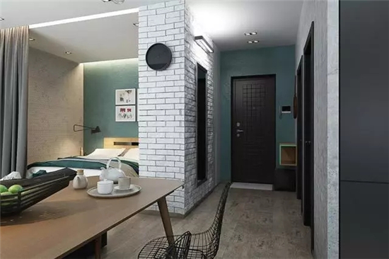 入门的玄关空间比较小,利用镜子和灯光,既能满足更衣需求,也能在视觉上减少小空间的拥挤感。与玄关一墙之隔的空间则划分为卧室区域。玄关和卧室的墙面选择同样的颜色进行粉刷,色调统一。