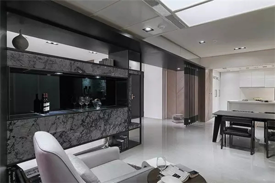 餐厅中的吧台,让每个空间都有隐形的场域定义,透过玄关,让空间有了与众不同的面貌。大理石餐桌让生活质感更为浓烈,黑白灰的整体色调让家装更显时尚。