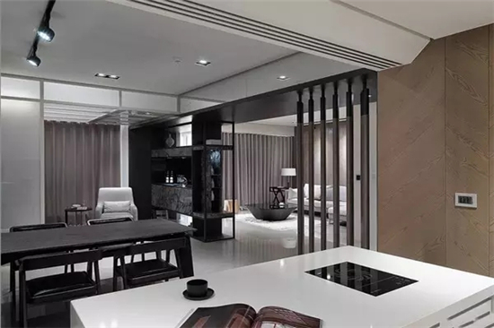 客厅和餐厅是采用透过镂空穿越的结构体,这样就达到开放却有所区分的理性值。也从中反映未来设计追求细致、轻薄的趋势,不会给人厚重感。