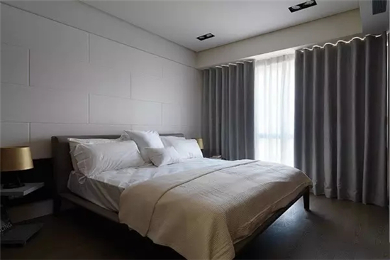 主卧的设计相对于居室其他空间就更简约了。床头与白色的几何分割造型,这就赋予了歇息处自在单纯的空间感。而另一头是隐藏机能,隐藏了通道转角的收纳玄机。