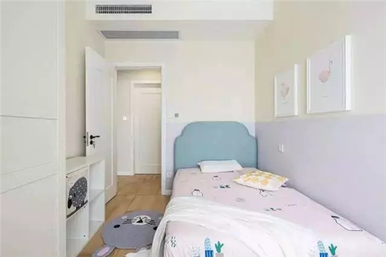 儿童房的墙面设计采用了香芋紫的护墙板,小孩子一般都喜欢在墙面上画画或者写字什么的,护墙板可以很好地保护原有的墙面。