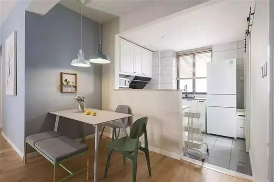 餐厅和开放式的厨房用一面半高的矮墙隔开,因为餐厅的光线没有厨房明亮,所以设计吊灯集中照明。