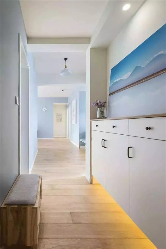 玄关的右手边有一个鞋柜,上面是蓝天白云的装饰画,鞋柜下面做了藏光处理,晚上回家很方便。