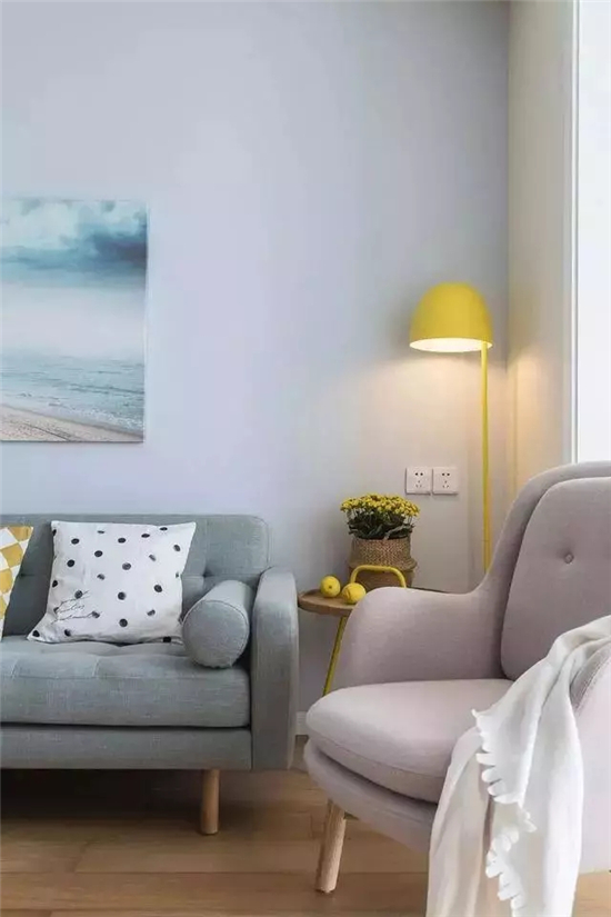 淡淡的香芋色的布艺单人沙发,淡灰色的长条沙发,比较小清新。