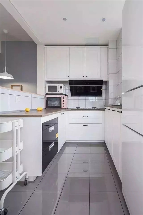 厨房是狭长型面积不大,划分好不同的功能区为日常使用的工具找到好的归属,东西大都放在了收纳柜里。