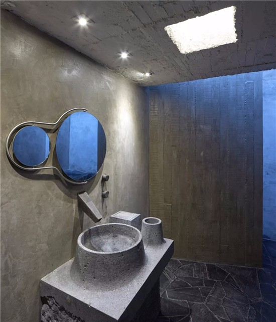卫生间的墙地面,配合天光的运用,一点也不显得逼仄,甚至卫生间的龙头都是用混凝土制成。