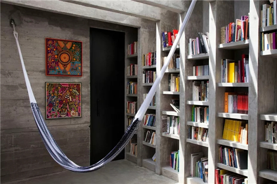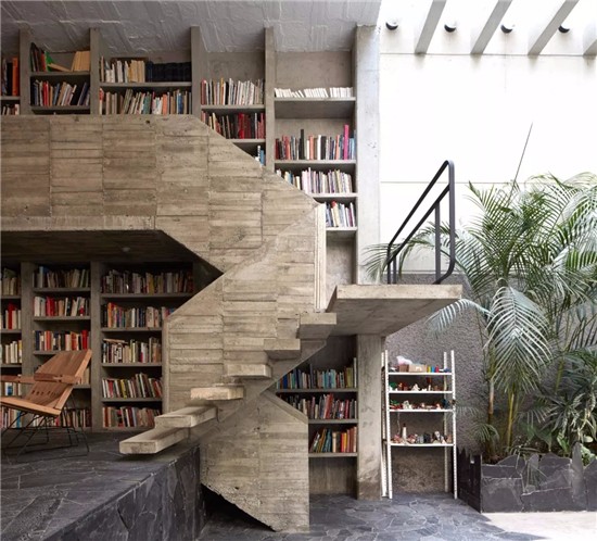 不只是楼梯栏板和踏步都是混凝土制造,他们两个还设计了很多家具包括书架、橱柜、卫浴,材质都是选用混凝土装修,这样的设计少了几分刻意,多了一丝自然。