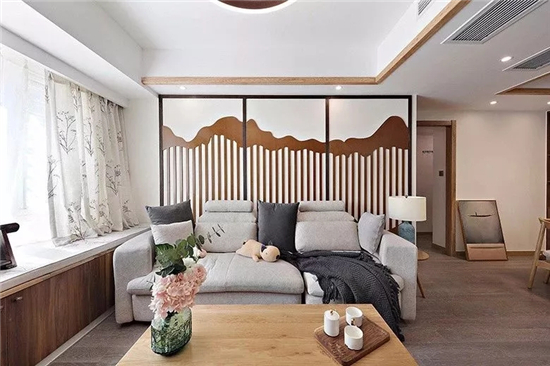 沙发背景墙处用实木造型来代替传统的山水装饰画,镂空的木质造型勾勒出起伏的山体,整体搭配时空间简约而不简单。