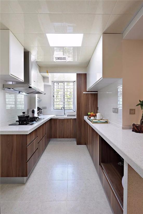 这套新中式的房子把厨房设计成了开放式,白色与木色的橱柜、吊柜让厨房不会太过单调。