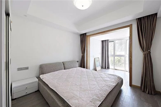 主卧室的设计更有现代感,浅灰色的床、窗帘搭配白色墙面和床品,阳台和卧室之间相连通,也让卧室更加的明亮、宽敞,营造出舒适安逸的快乐生活居所。