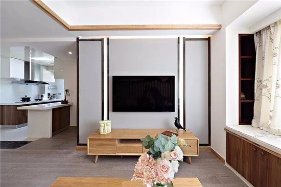 浅灰色的电视背景墙经过实木封边的边框造型的映衬,更具立体感了。