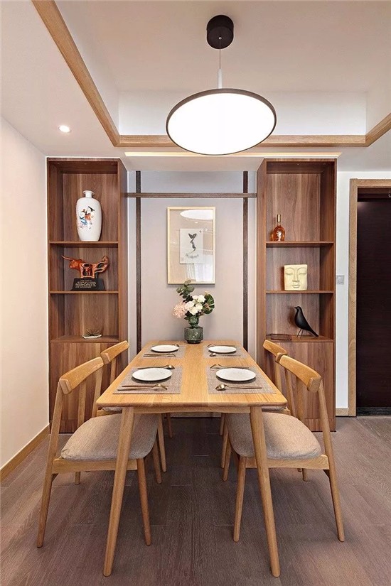 餐厅摆放了原木风的餐桌椅并在两侧设计了嵌入式的餐边柜,造型的背景墙有着中式风独特的韵味。