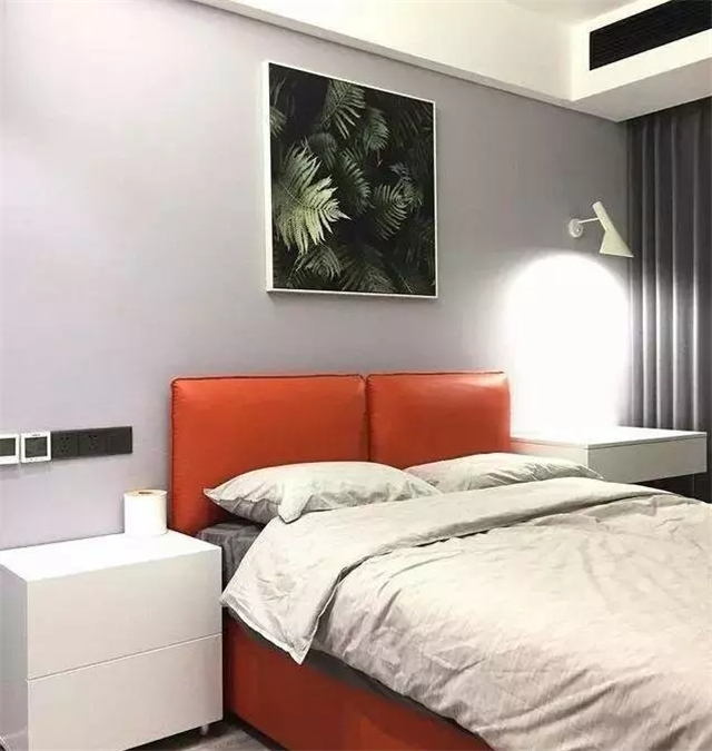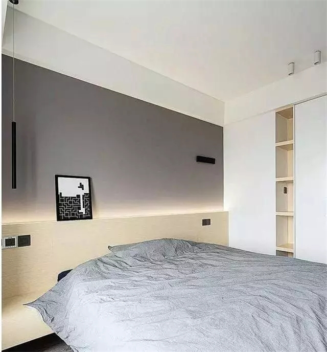 卧室也是极简装修,灰、白、原木三色混搭,卧室背景加了灯带照明,挺好看的。