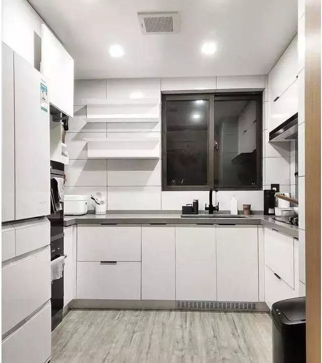 厨房灰白装修,结果还是很漂亮的。厨房大电器都布置的很好,看起来整洁舒适。