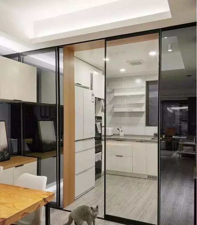 厨房采用细框玻璃门隔断,黑色门框很有金属质感,稳重又大气。