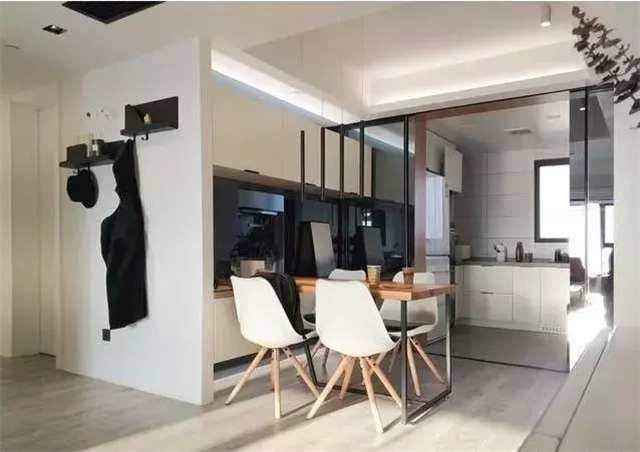 餐厅简易实用,桌椅轻巧灵活,白色配原木色漂亮极了。餐边柜中间采用镜面装饰,有着扩大空间的效果。
