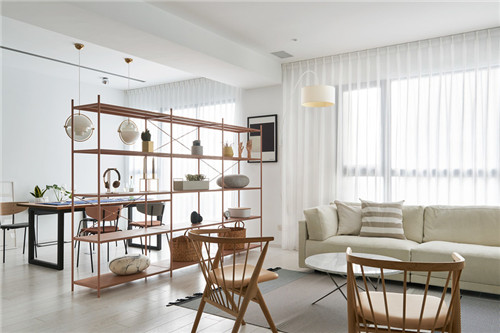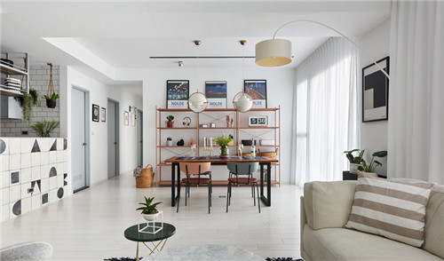 开放式客餐厅,显得空间更宽敞,原木 铁艺材质的餐桌椅,颇有工业风气质。