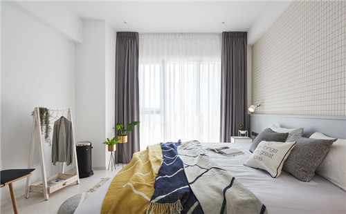 玄关另一侧简单设计了挂衣架和换鞋凳,小方格壁纸满是小清新的味道。